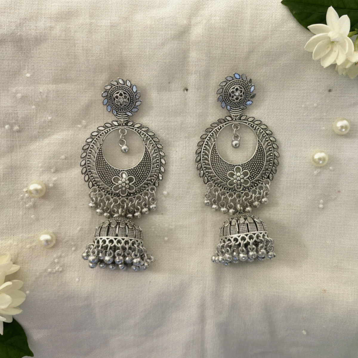Variant 1: Floral Moon Jhumka – Half-moon floral motif with oxidized dome jhumka.