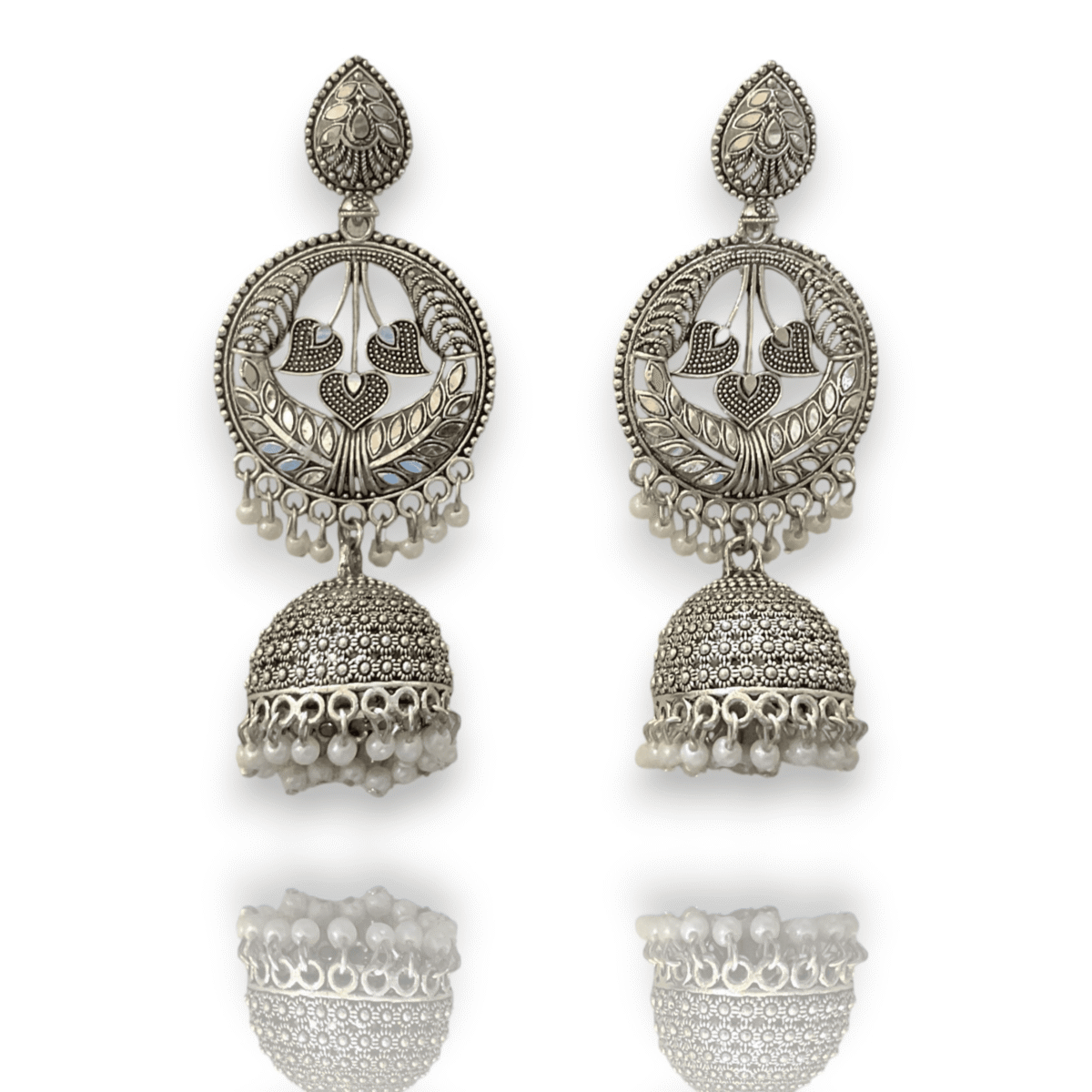 Antique-style oxidized jhumkas with intricate detailing. A versatile pick for ethnic and casual wear.