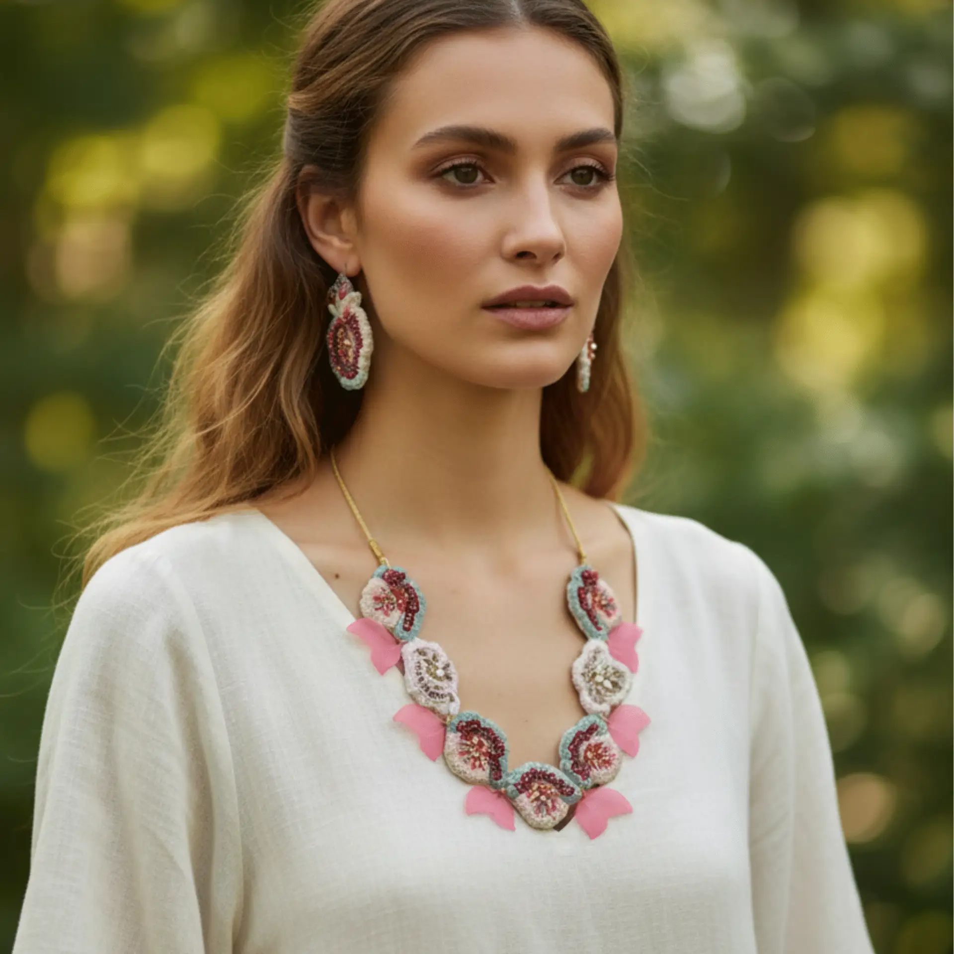 This unique textile jewelry set showcases the beauty of traditional embroidery techniques combined with contemporary design sensibilities. Each floral element is carefully hand-embroidered with colorful threads and embellished with seed beads and sequins, creating rich textural interest. Pink fabric butterfly or leaf accents add dimensional elements that create beautiful movement. The matching earrings complete the bohemian aesthetic. Perfect for festival wear, casual outings, and occasions where artistic, handcrafted accessories are appreciated. This set celebrates the intersection of textile arts and jewelry design.