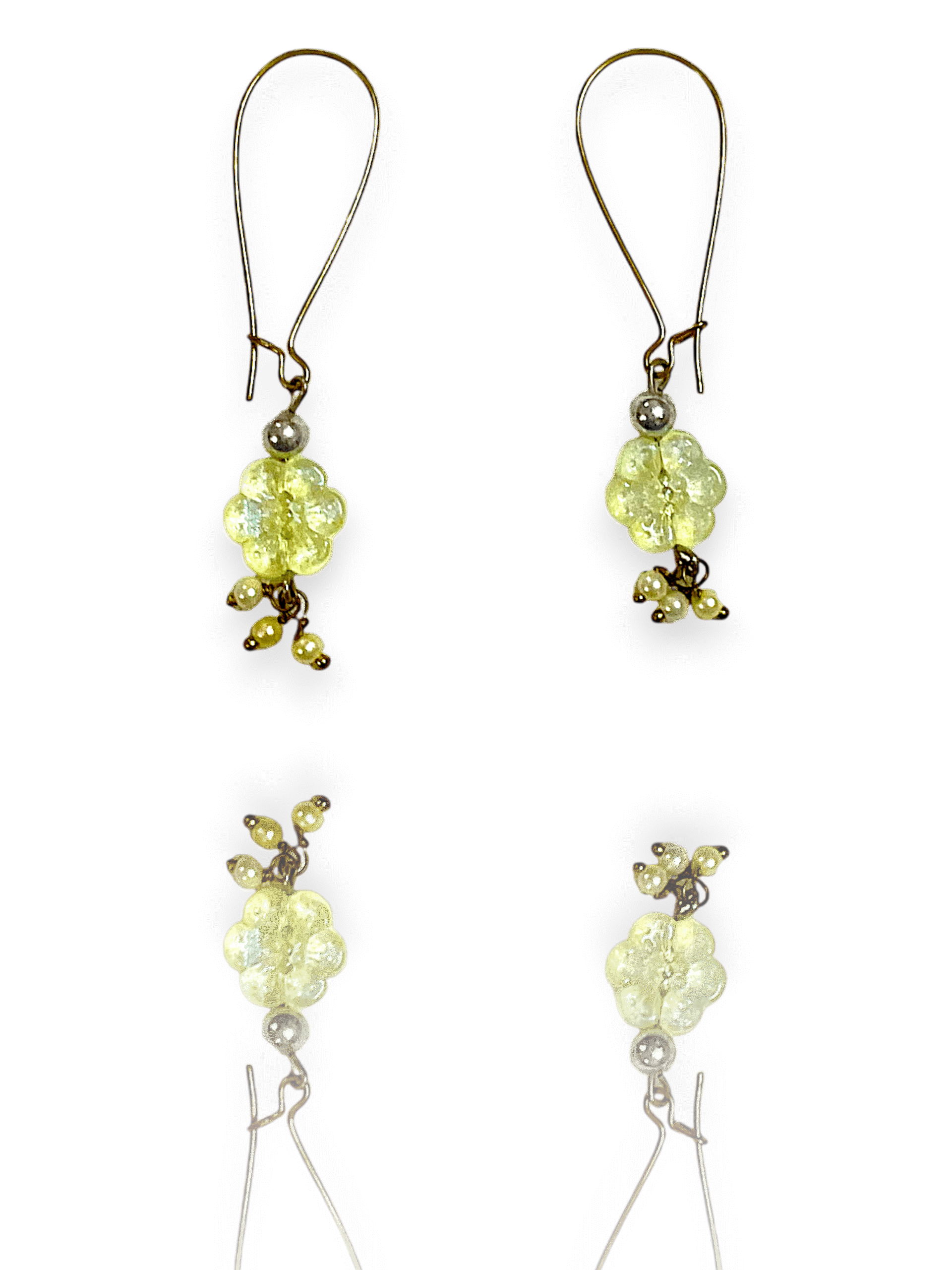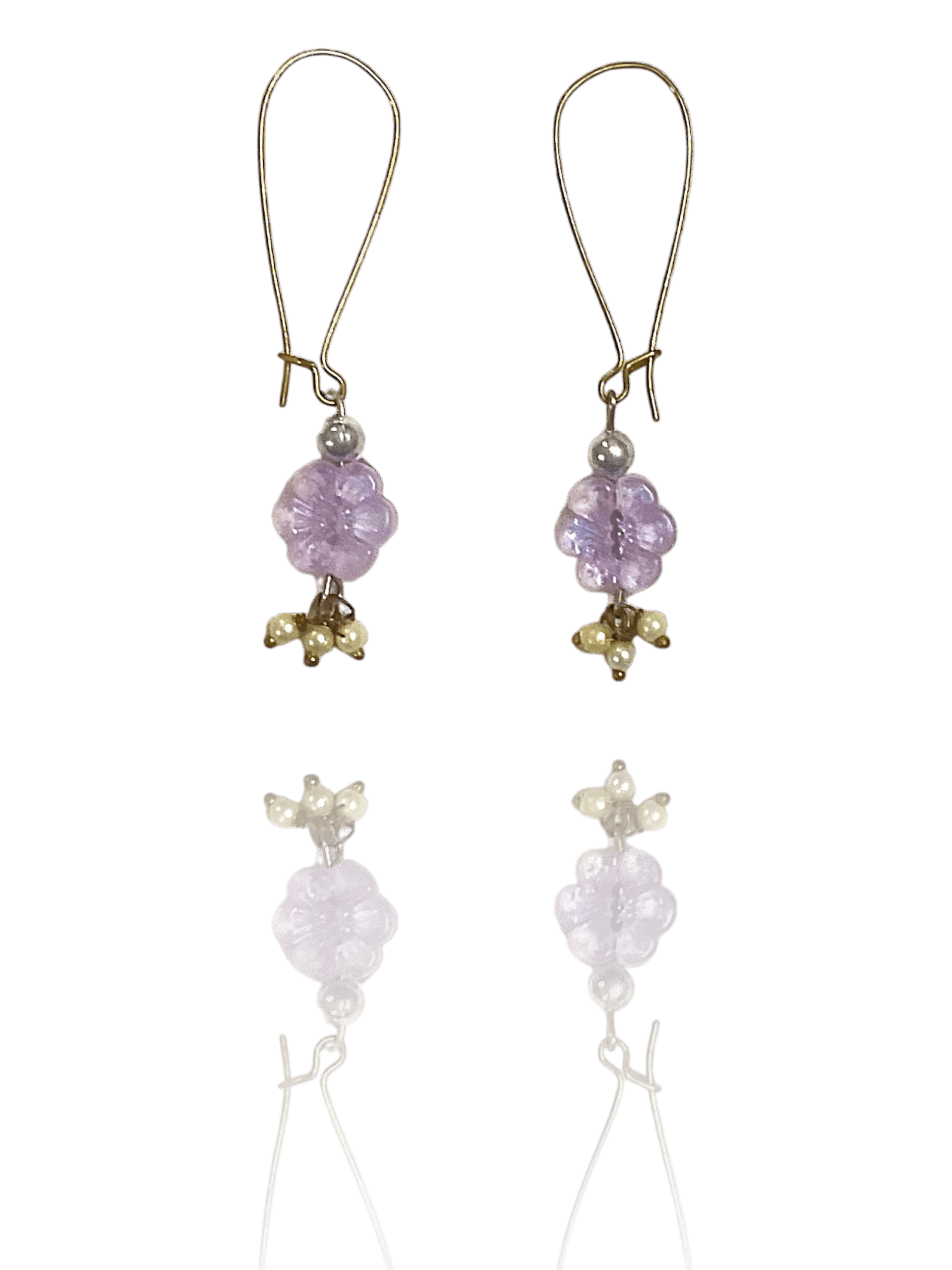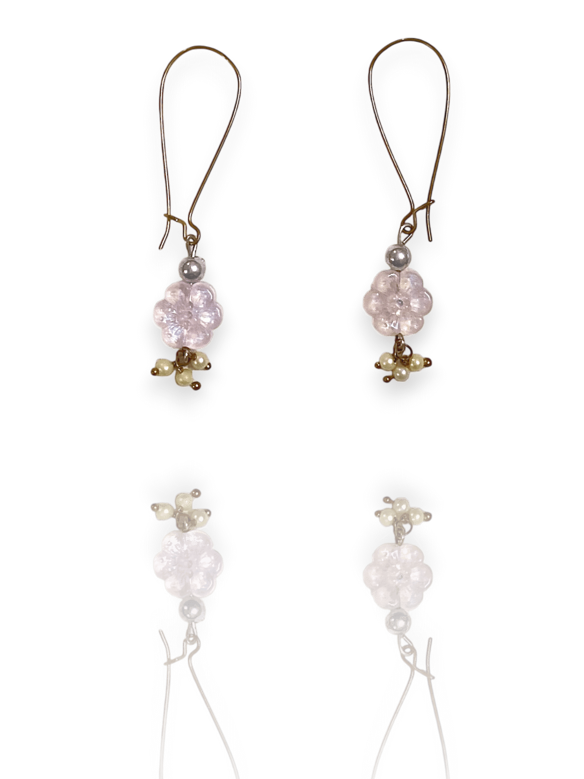 Add a touch of artisan elegance to your jewelry collection with these stunning handcrafted glass floral drop earrings. Each pair features intricately carved glass flower beads that capture and reflect light beautifully, creating subtle sparkle with every movement.