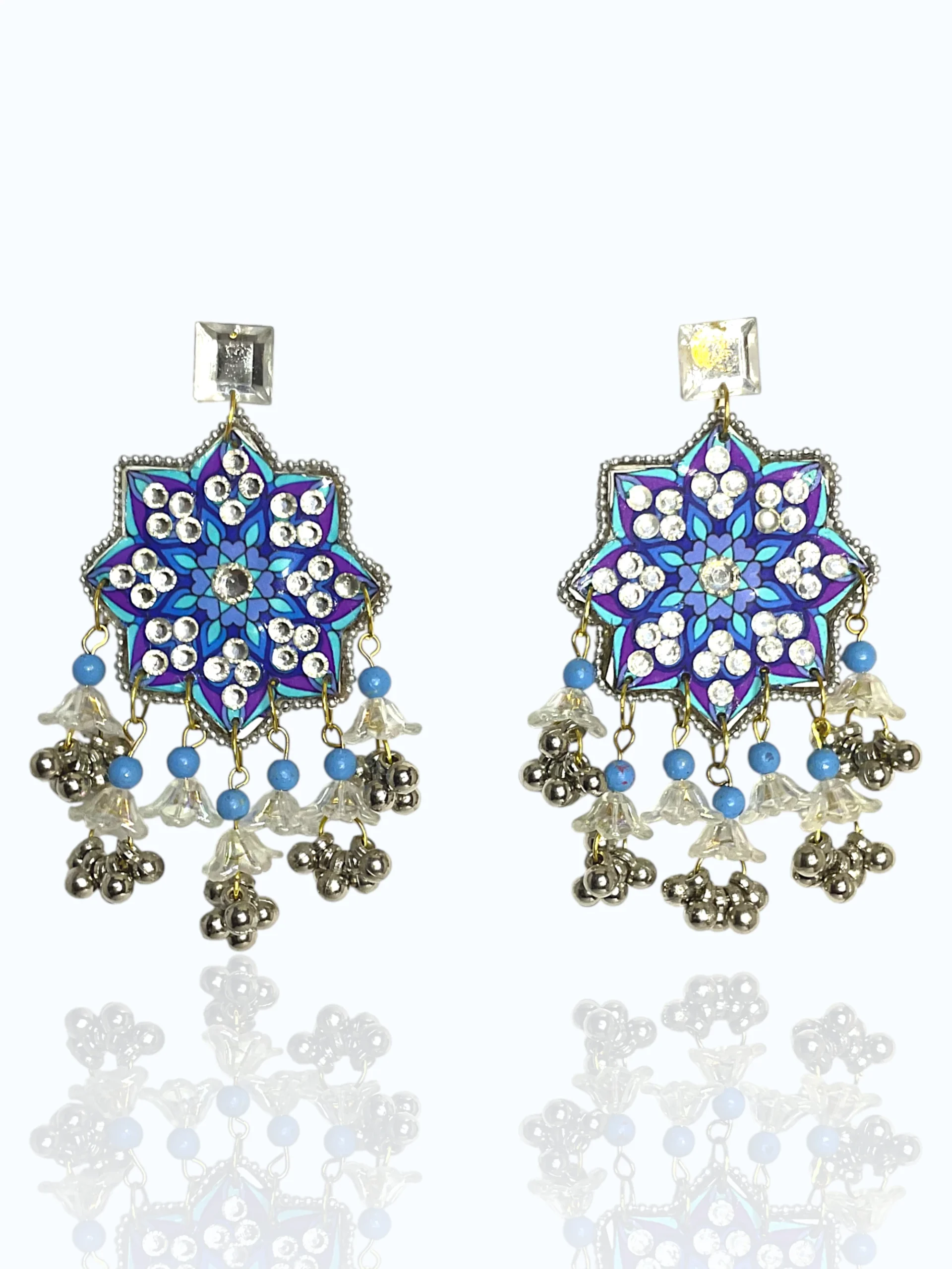 Elevate your ethnic elegance with these exquisite Nacima Mandala Flower Earrings, a stunning fusion of traditional craftsmanship and contemporary design. These statement chandelier earrings feature intricately designed mandala flower patterns in vibrant blue and purple hues, adorned with sparkling crystal stones that catch the light beautifully from every angle.
