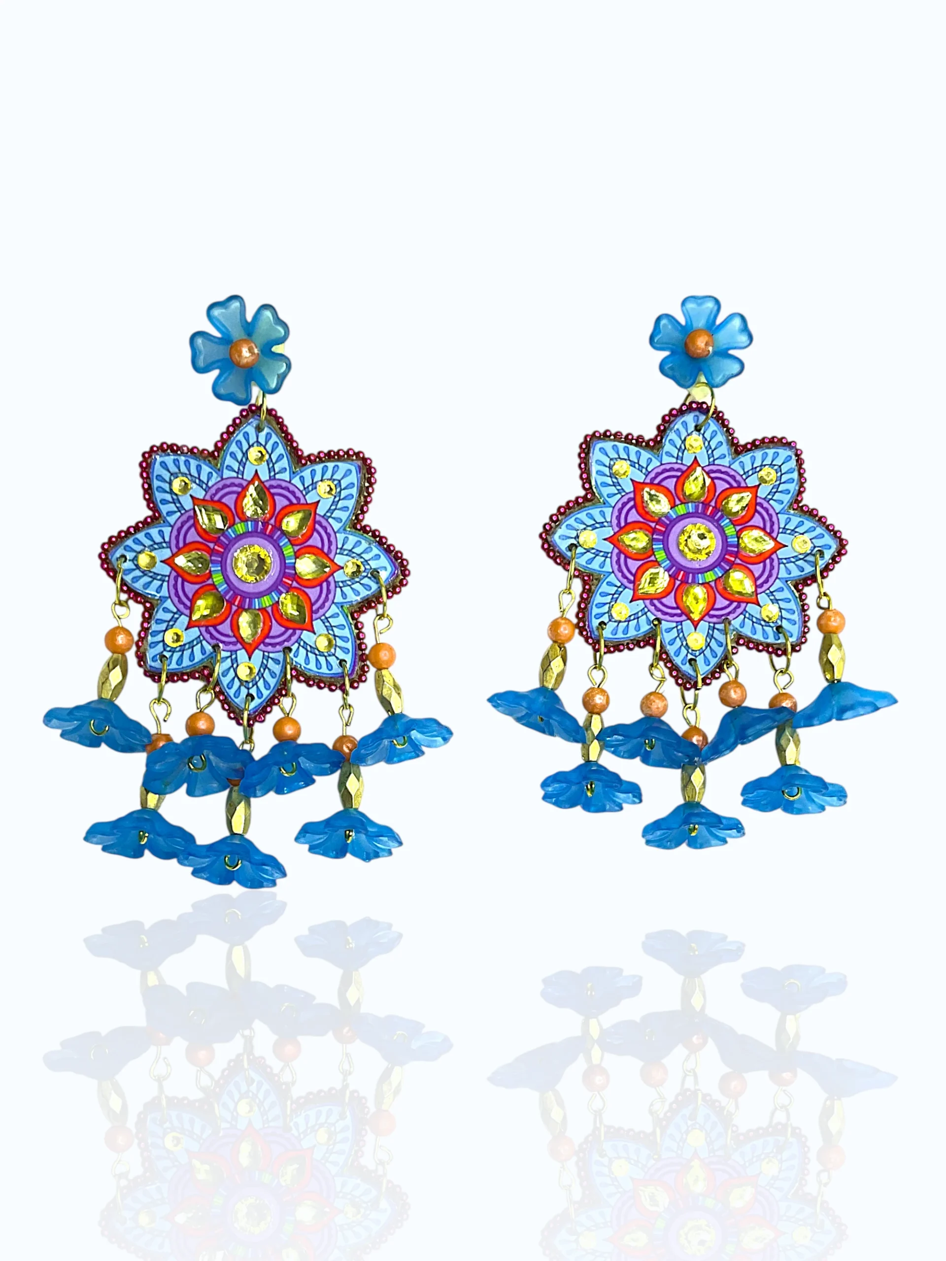 The crowning glory is a charming blue acrylic flower stud at the top, adding a playful yet elegant touch. Cascading from the main medallion are delicate golden chains adorned with warm amber-toned beads, culminating in a charming row of blue acrylic flower danglers that create graceful movement with every turn of your head.