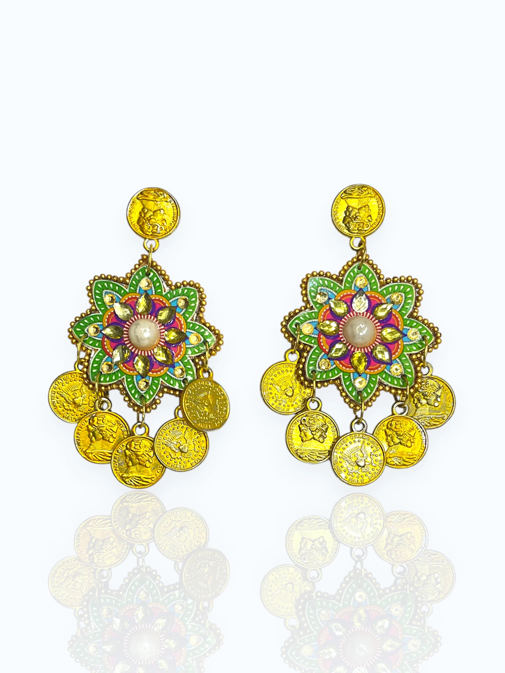 The ornate mandala design showcases meticulous detailing with golden beaded borders and jewel-toned accents that create a stunning visual appeal. Each earring is crowned with a golden coin stud at the top, adding a classic touch to the design.