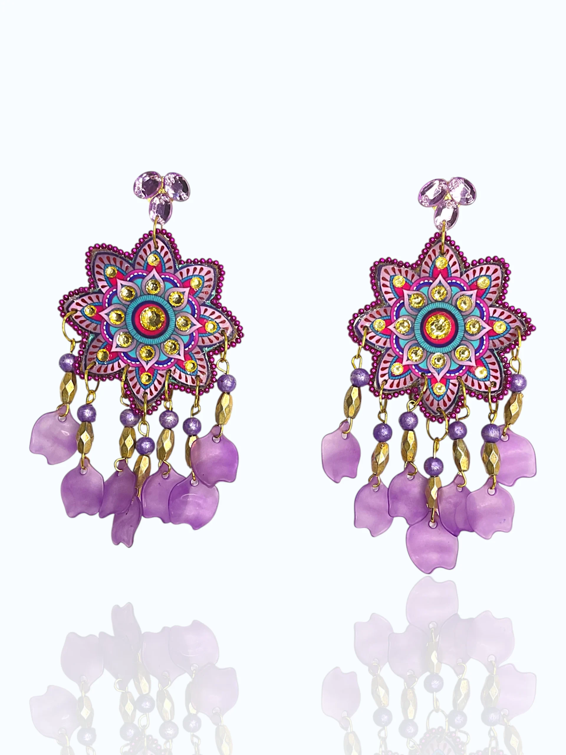 The mandala design is beautifully embellished with golden stone accents that sparkle brilliantly, surrounded by detailed beadwork in deep burgundy tones that add texture and dimension. At the top, elegant purple crystal studs provide a sophisticated finishing touch, while the dangling acrylic leaf elements in soft lavender purple create graceful movement with every turn of your head.