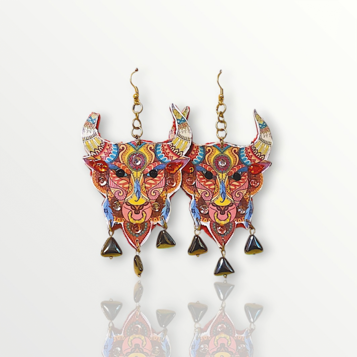 These striking statement earrings feature vibrant demon face designs with intricate traditional patterns in red, blue, and gold tones. Each earring showcases detailed craftsmanship with colorful enamel work, decorative horns, and dangling black bell elements that add movement and sound. Perfect for making a bold fashion statement.